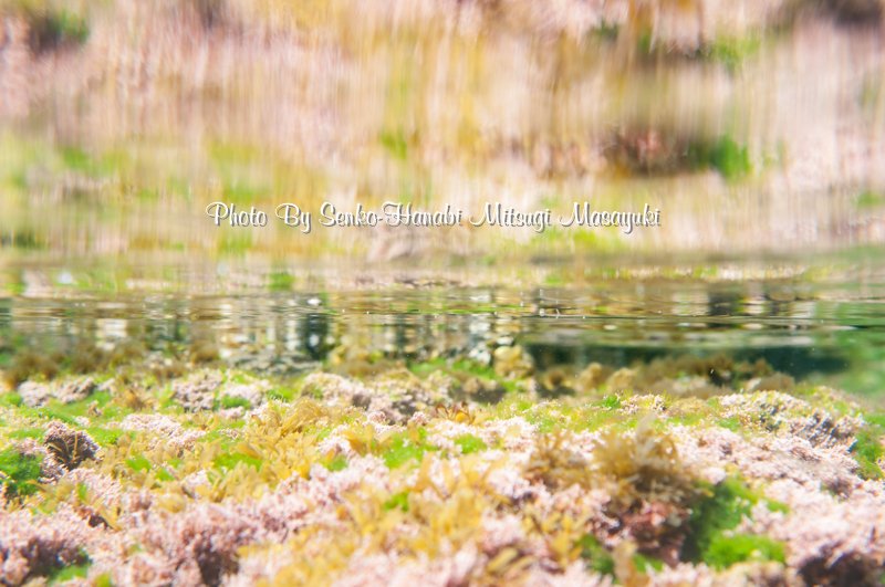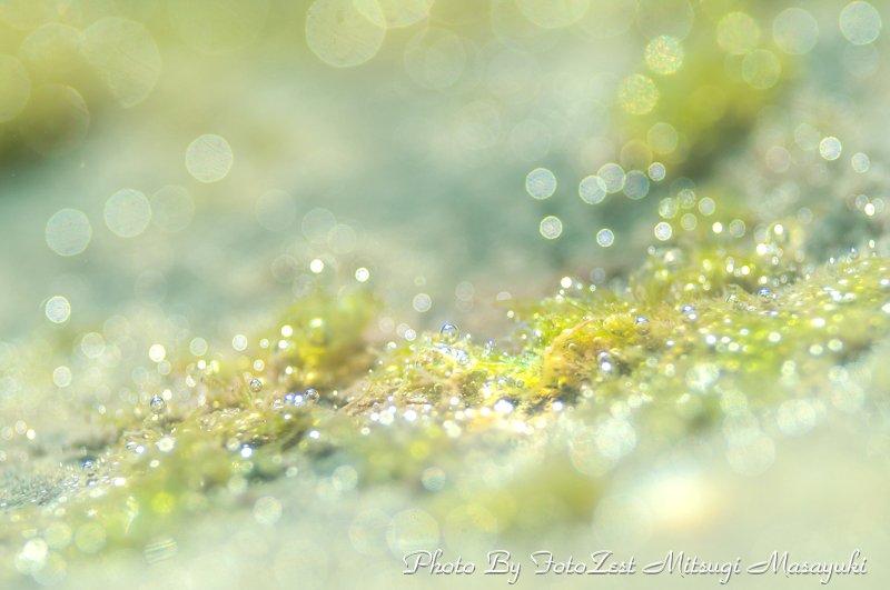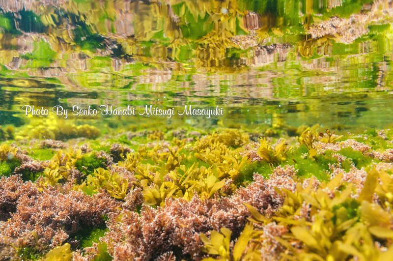 ボウアオノリやヒトエグサ、アオモグサの緑と、泡とフクロノリ、カゴメノリが作る金色の世界。